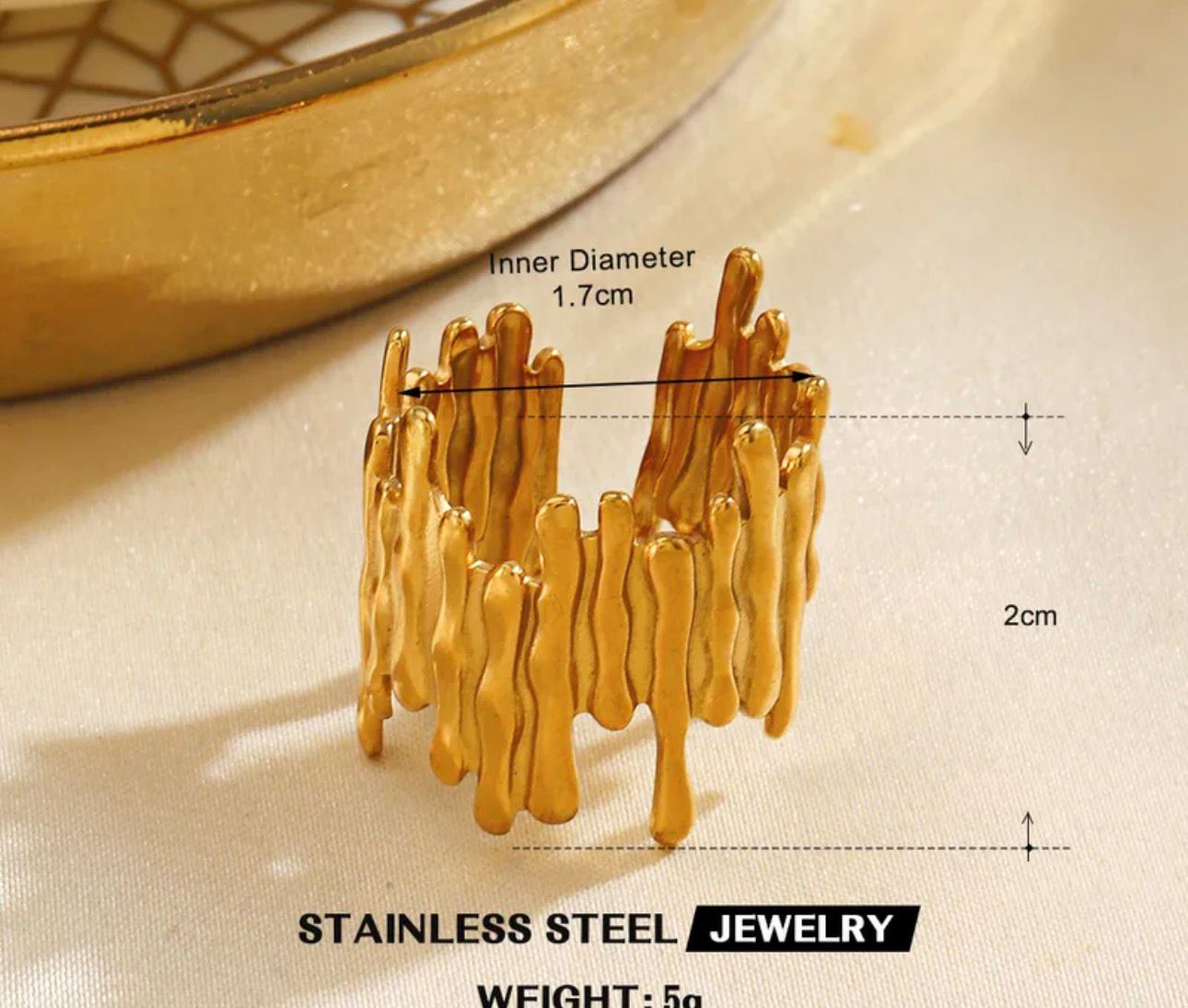 Anillo dorado de acero inoxidable con diseño ondulado y textura irregular, inspirado en llamas modernas.