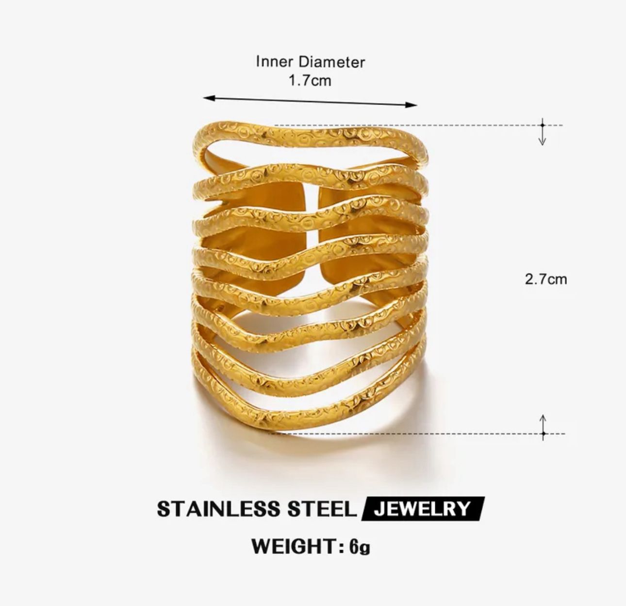 Anillo amplio de diseño ondulado en acabado dorado con textura, que envuelve el dedo con líneas fluidas y elegantes. Su estilo llamativo y moderno lo convierte en una pieza protagonista, perfecta para looks sofisticados y atrevidos.