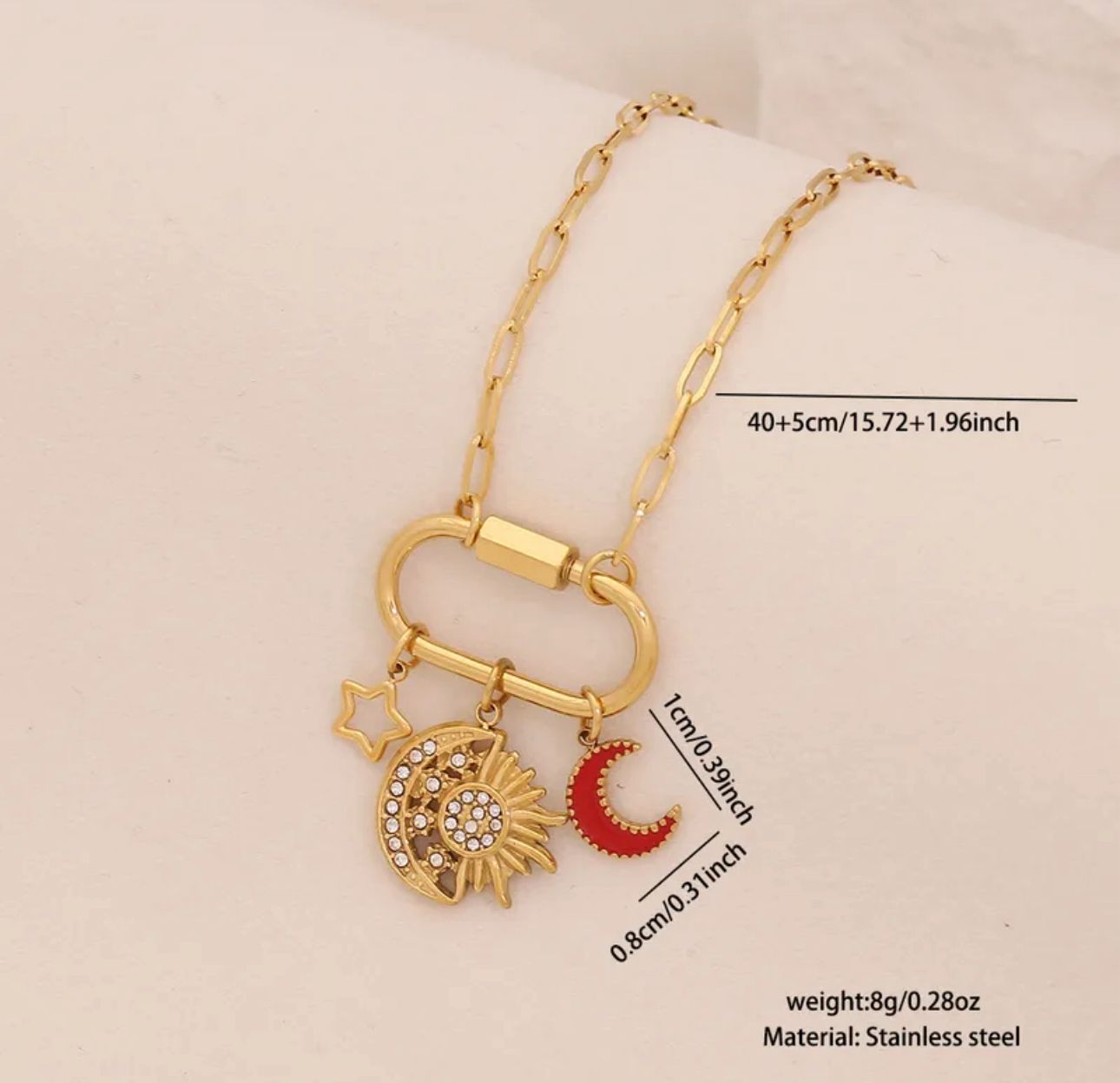 Collar dorado con dije de eslabón decorado con una estrella, un sol con luna incrustada y una luna roja. Su diseño celestial fusiona encanto cósmico y estilo moderno, ideal para quienes aman los detalles únicos y simbólicos.