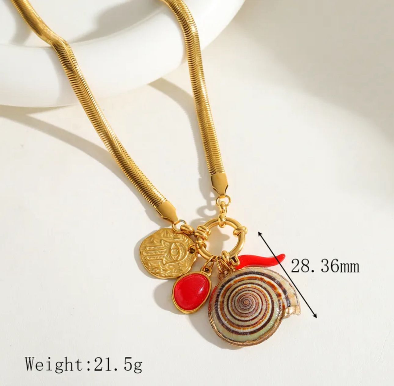 Collar dorado de estilo bohemio con dijes colgantes en tonos rojos y dorados, incluyendo un caracol de diseño artesanal. Ideal para un look vibrante y original con toque étnico.