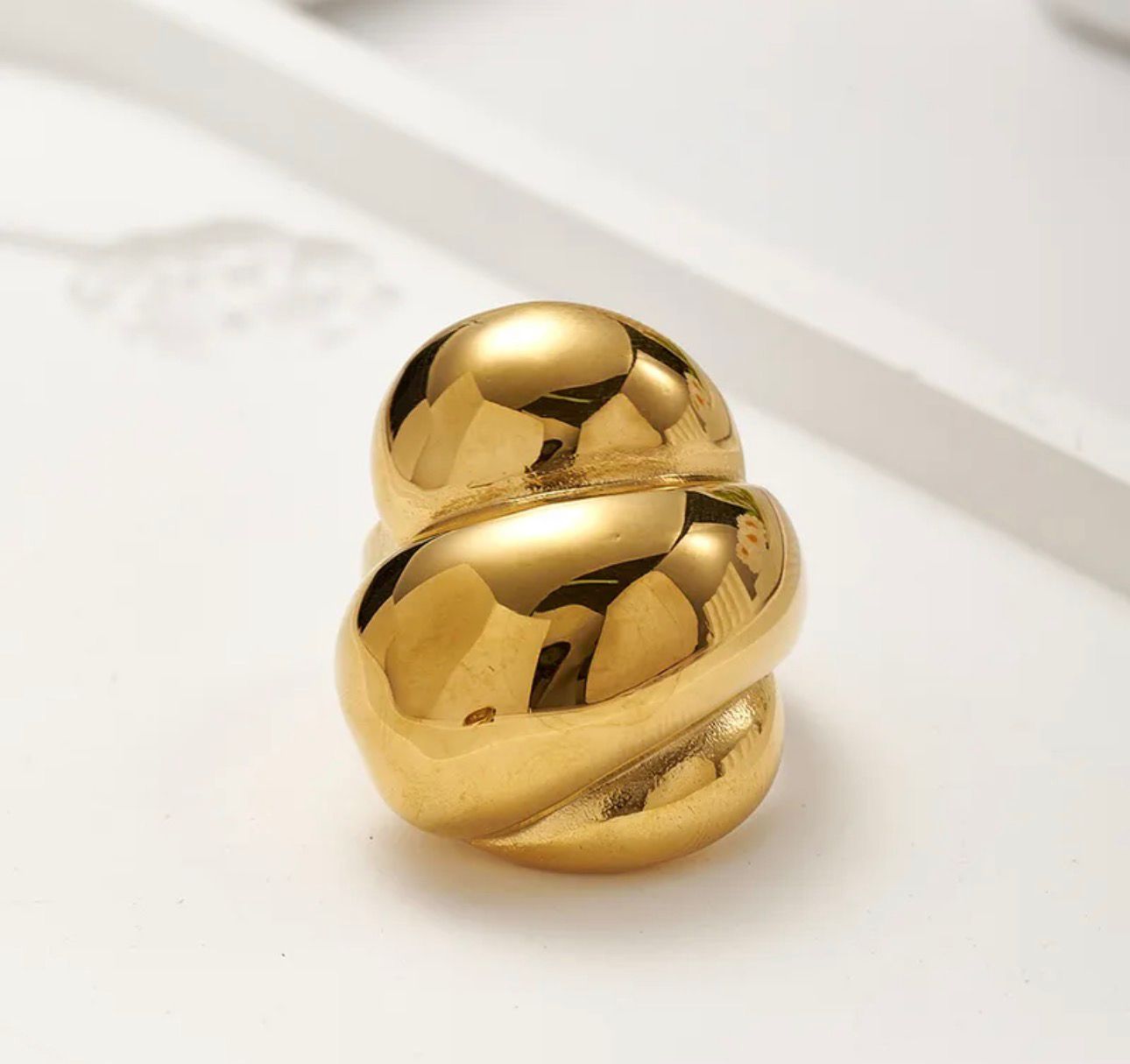 Anillo dorado de diseño ancho con forma entrelazada y acabado brillante, elegante y moderno.