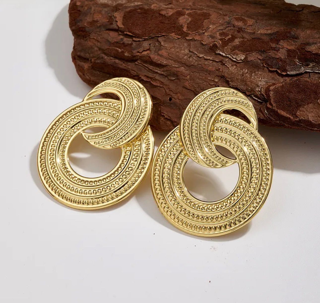 Aretes dorados entrelazados con textura detallada, elegantes y llamativos.