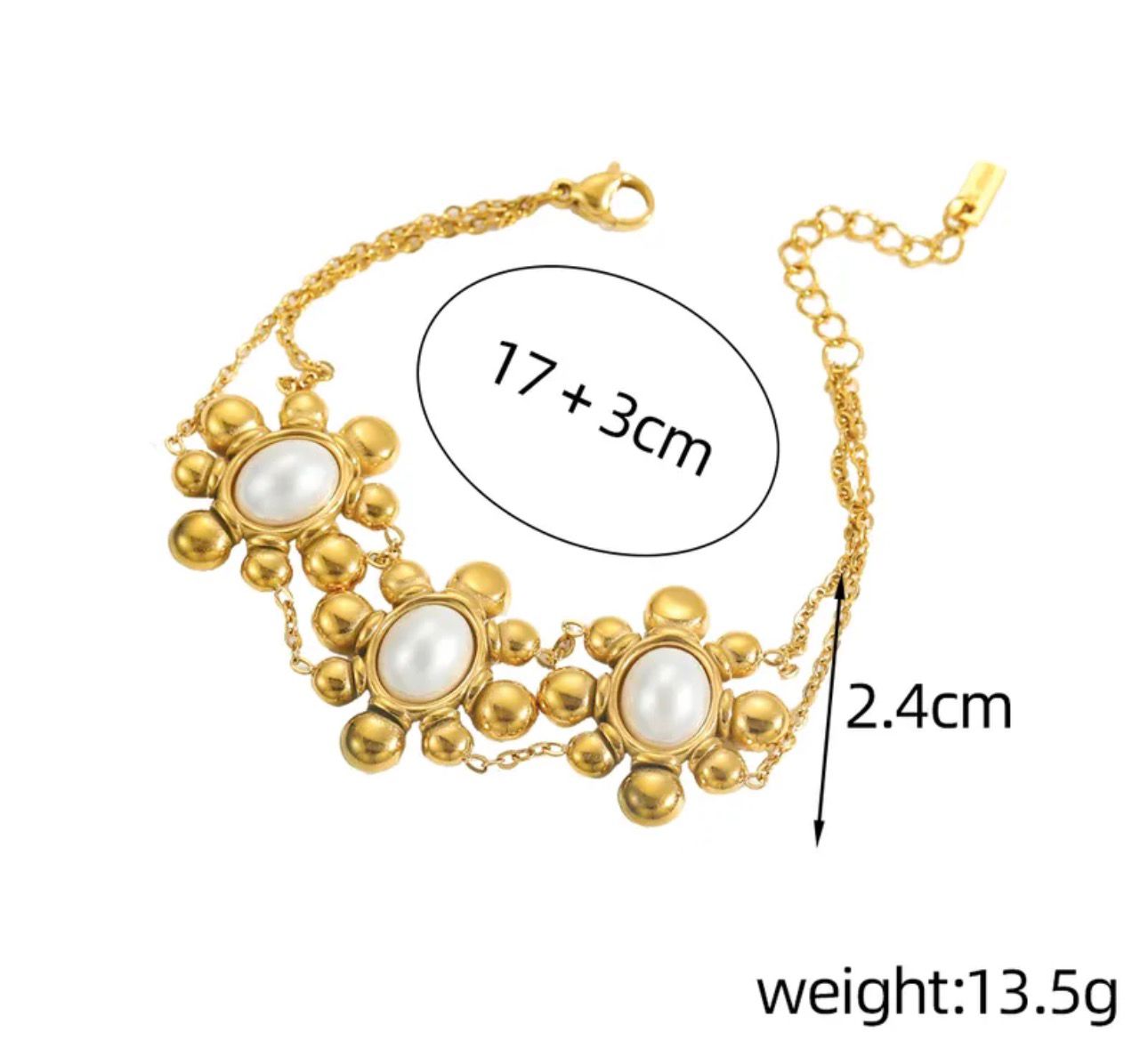 Pulsera dorada adornada con perlas en forma de flores, elegante y delicada.