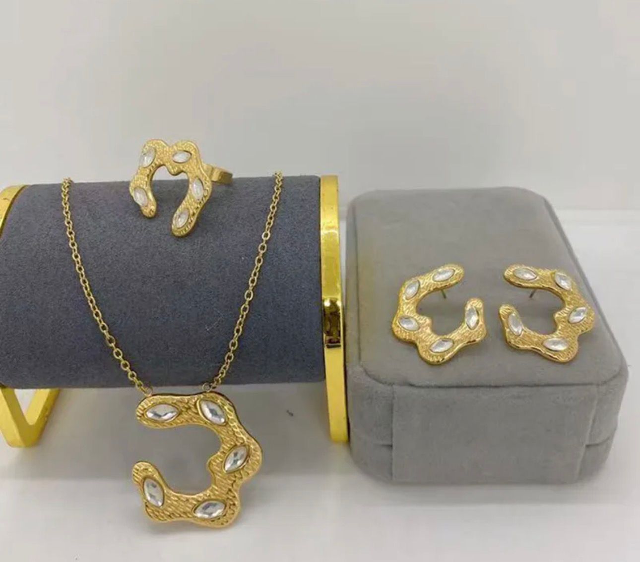Set dorado de collar, aretes y anillo con formas orgánicas y incrustaciones brillantes, moderno y único.