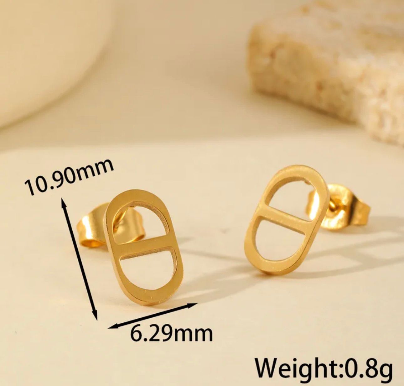 Aretes pequeños dorados en forma oval con diseño minimalista y moderno.