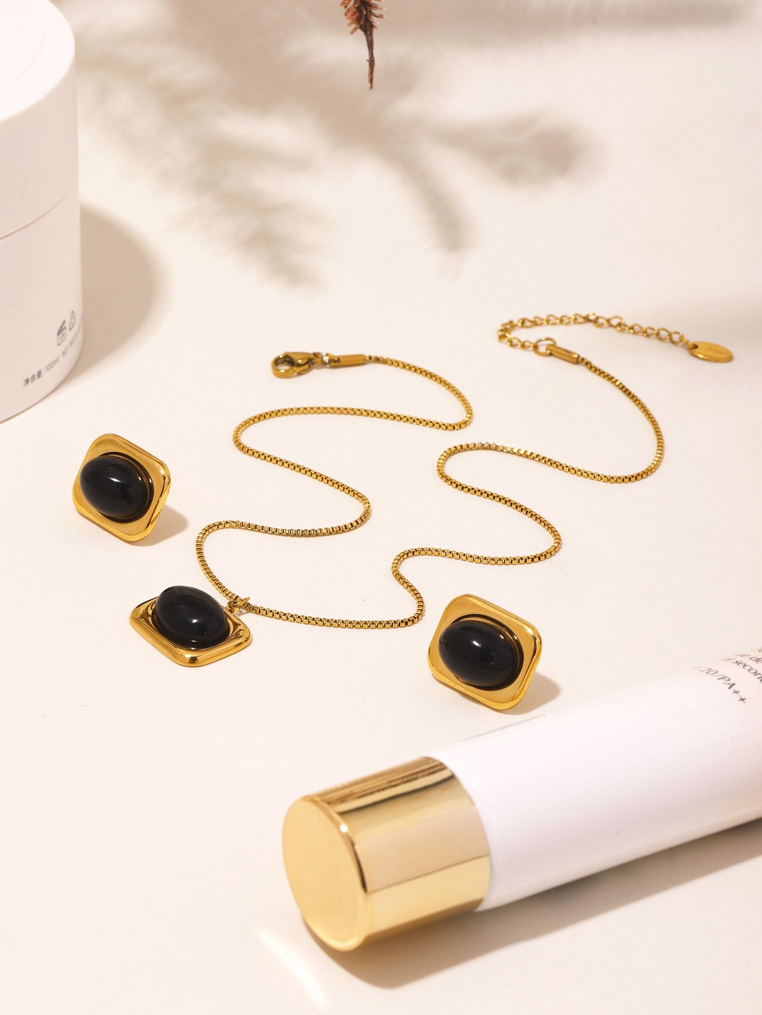 Conjunto elegante de acero dorado con piedras negras brillantes