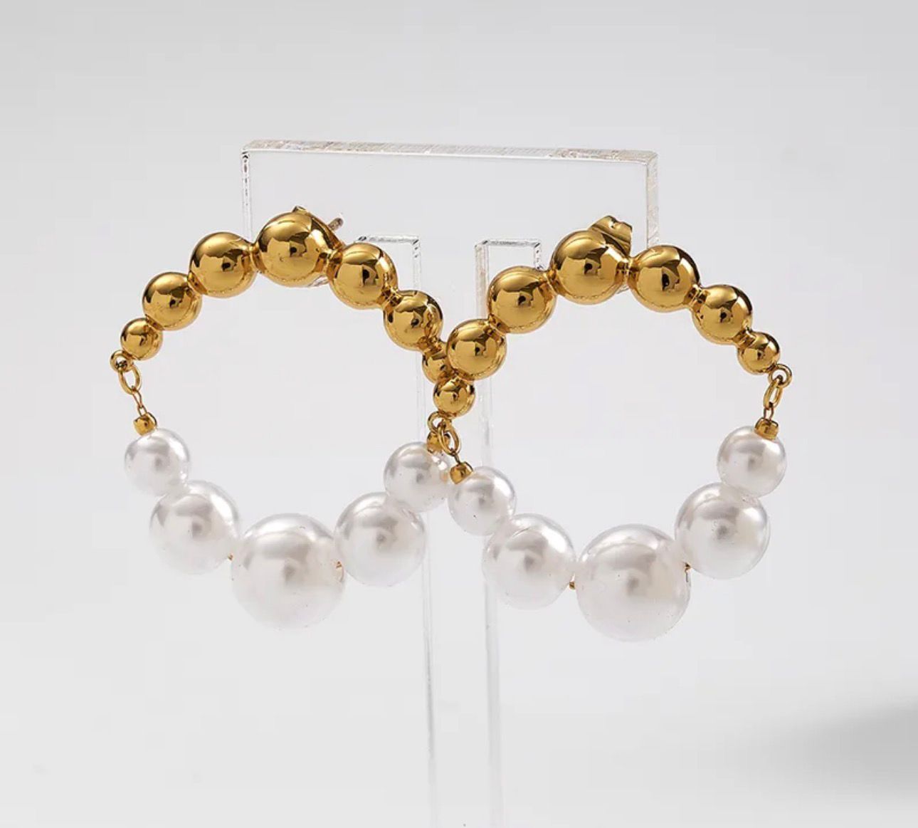 Aretes dorados en aro combinados con perlas blancas, elegantes y clásicos.