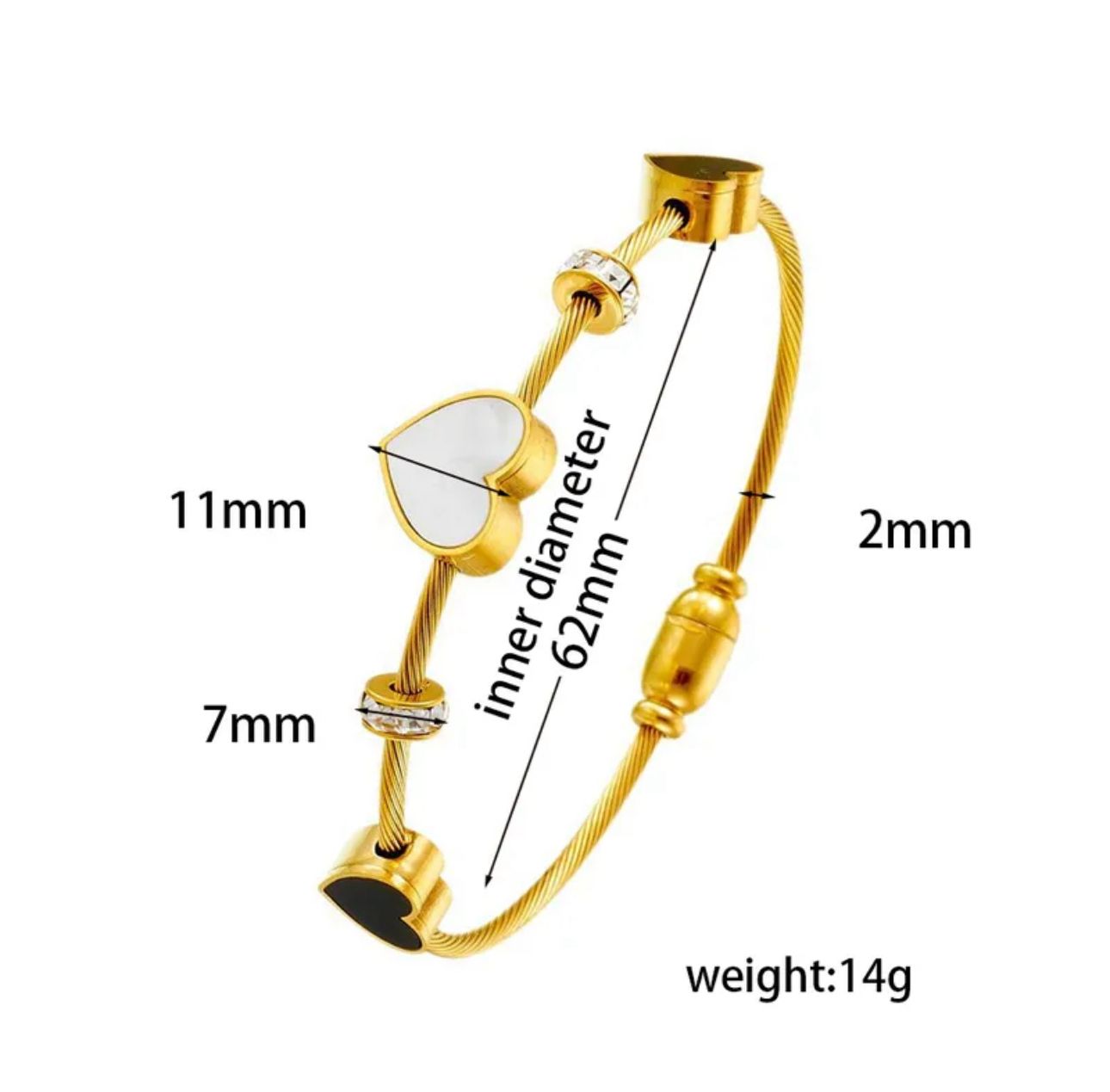 Pulsera de cable dorado con detalles en forma de corazón en blanco y negro, acompañada de separadores brillantes. Ideal para un look moderno y delicado.