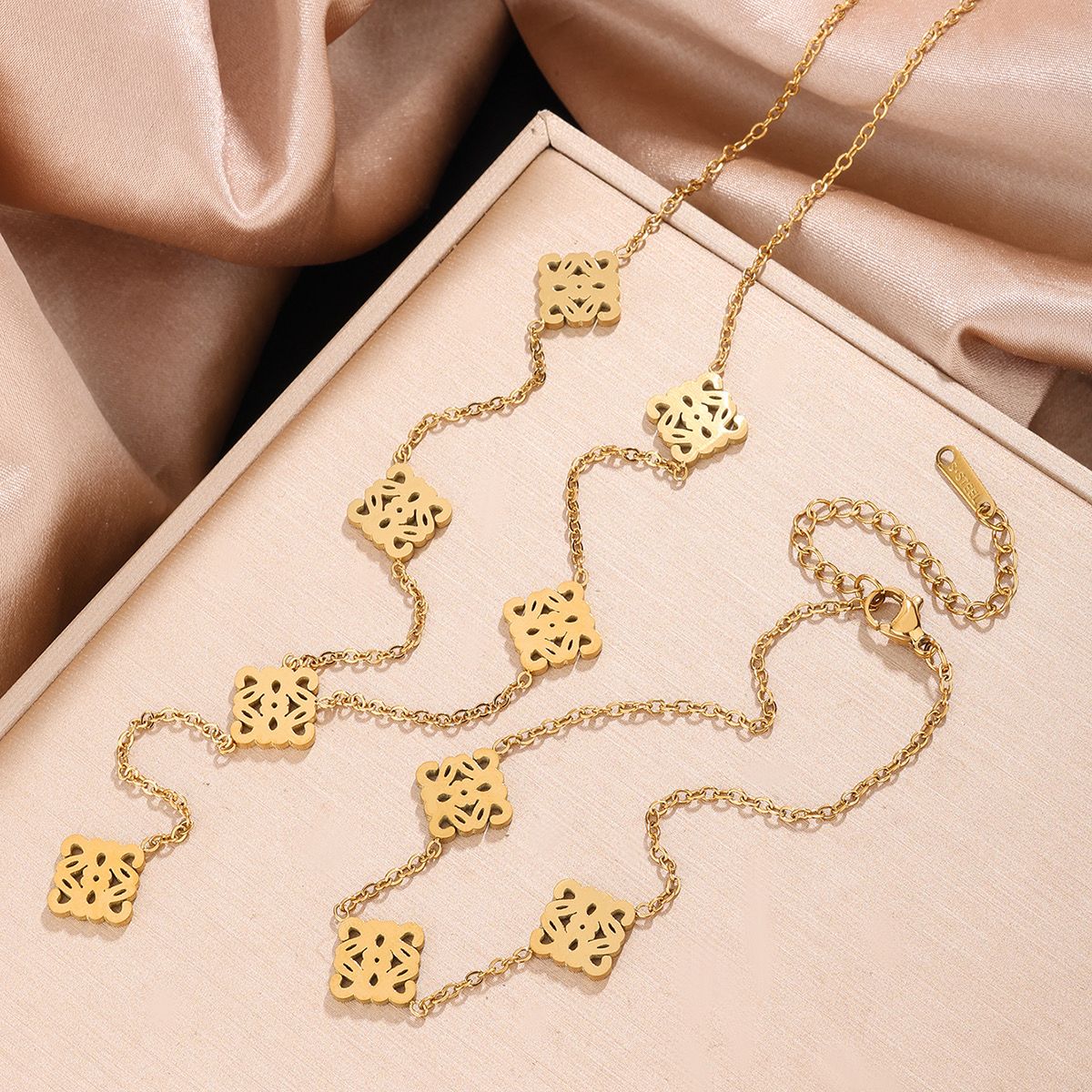Juego de collar y pulsera en acero dorado con dijes cuadrados calados, elegantes y sofisticados.