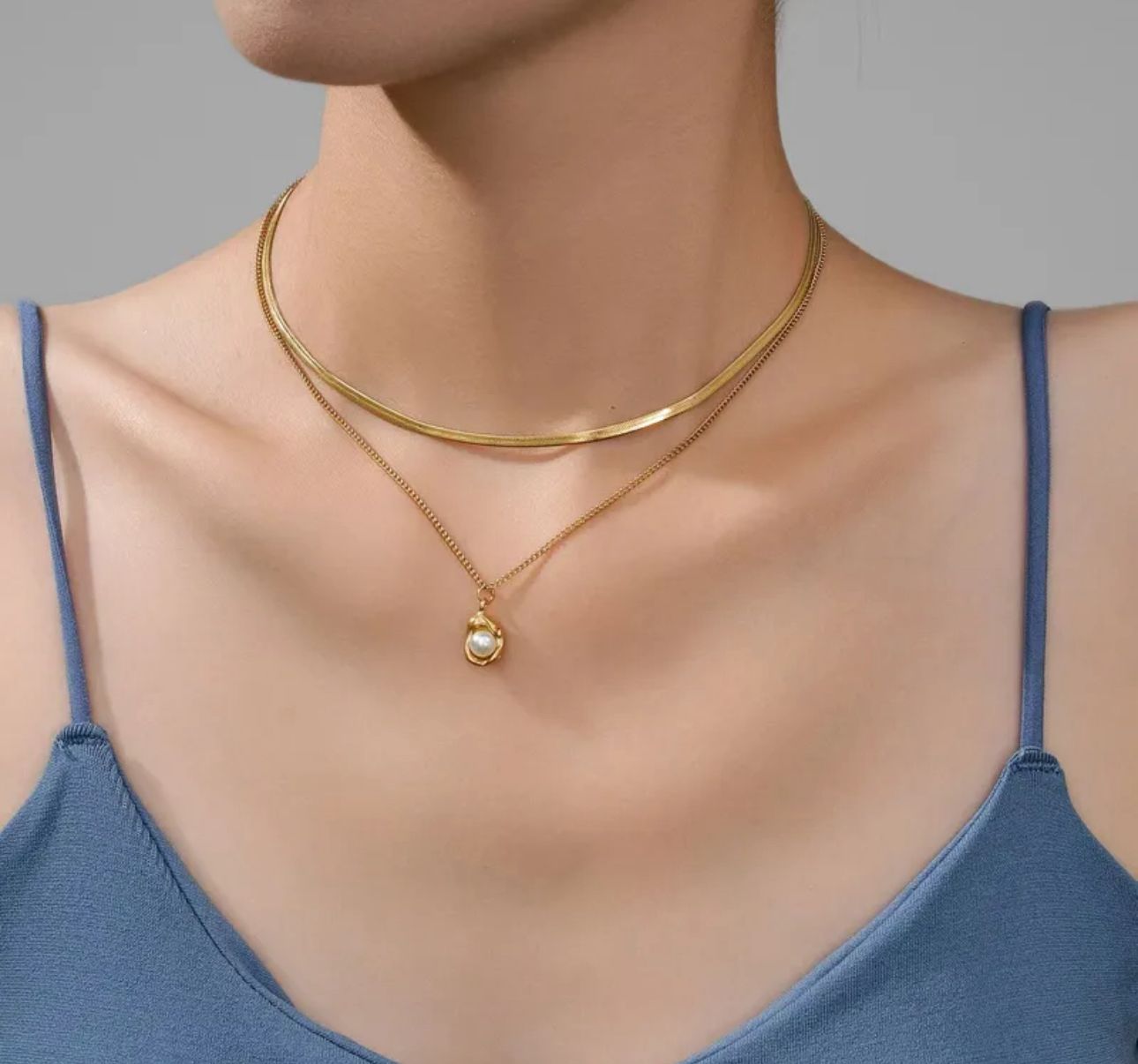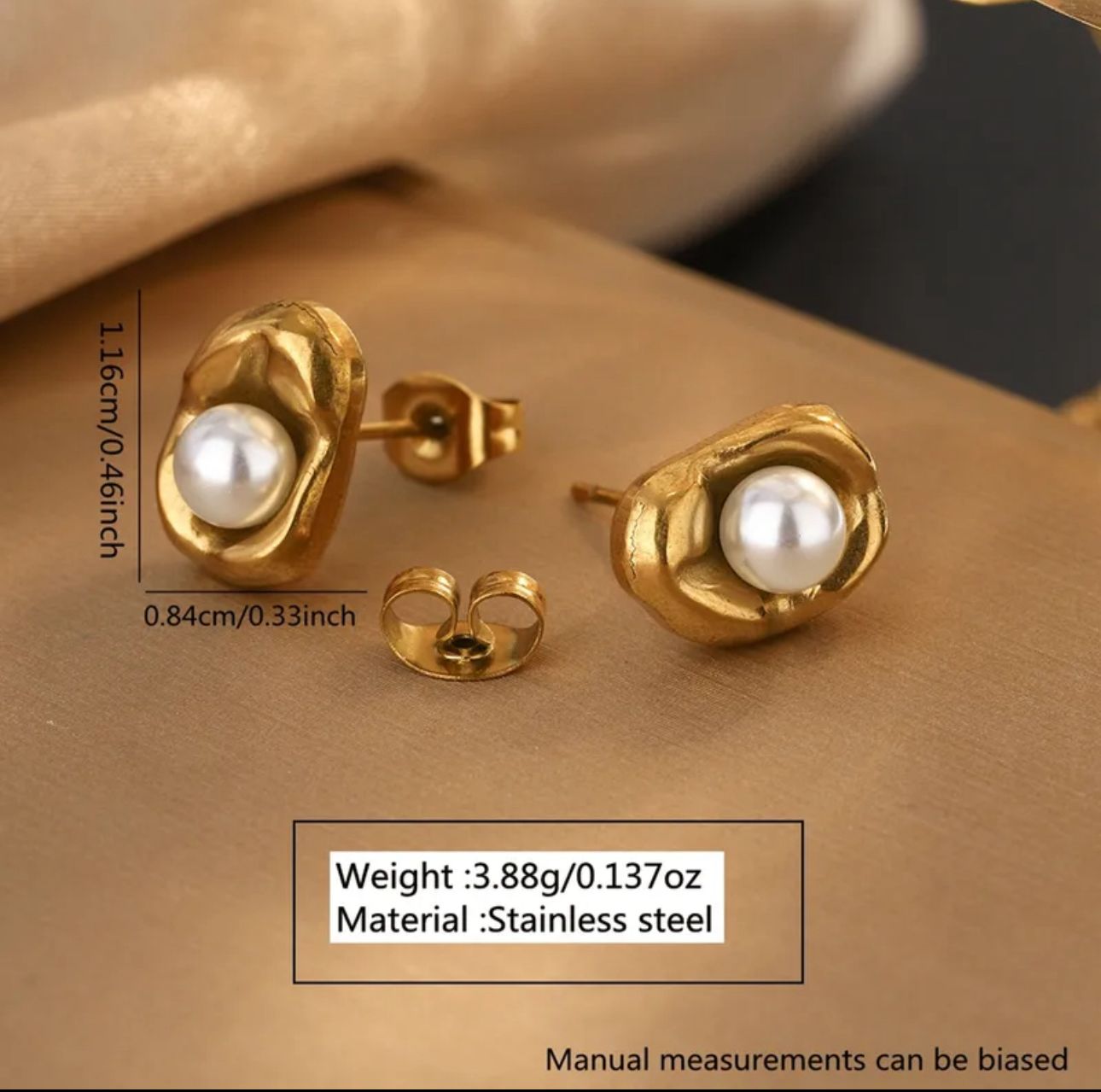 Una joya de inspiración artística, este set combina formas orgánicas doradas con perlas nacaradas que evocan elegancia natural. El diseño moderno y escultórico del collar y los aretes da un aire sofisticado y distintivo, ideal para quienes buscan destacar con clase y originalidad.
