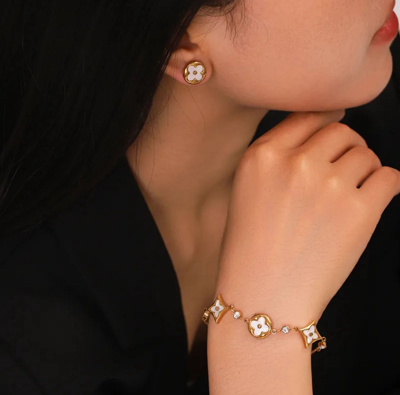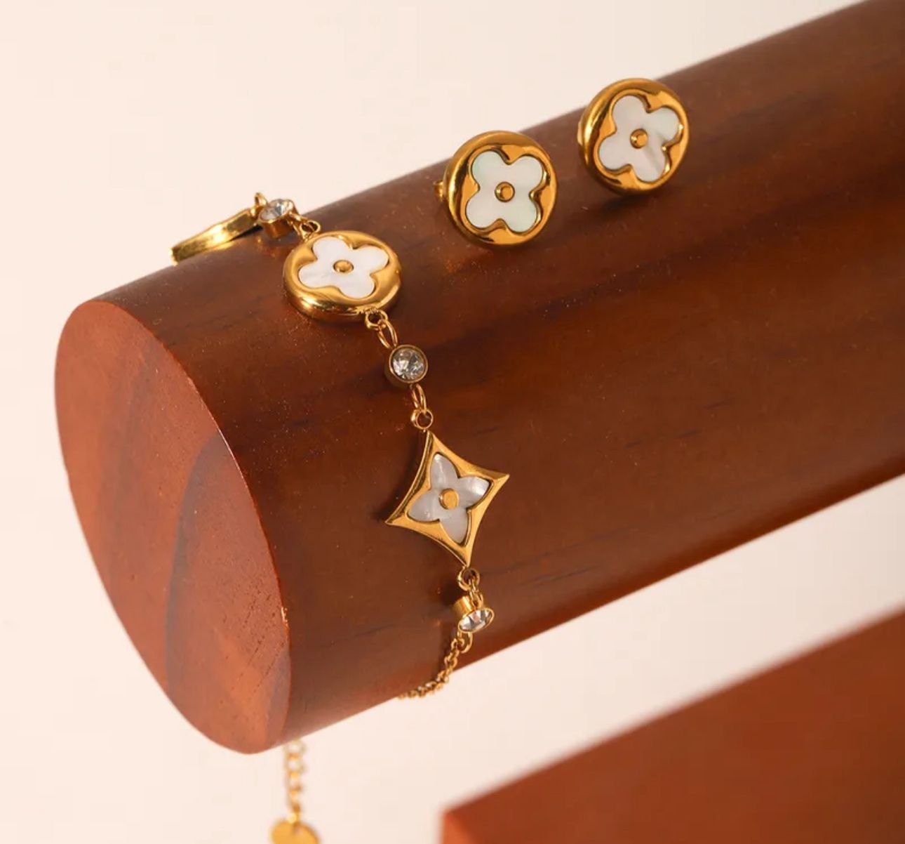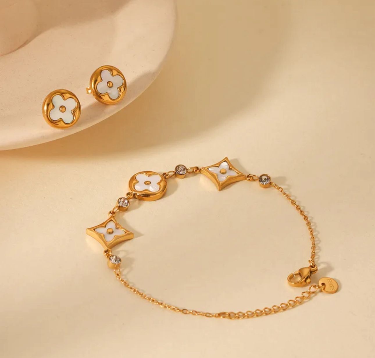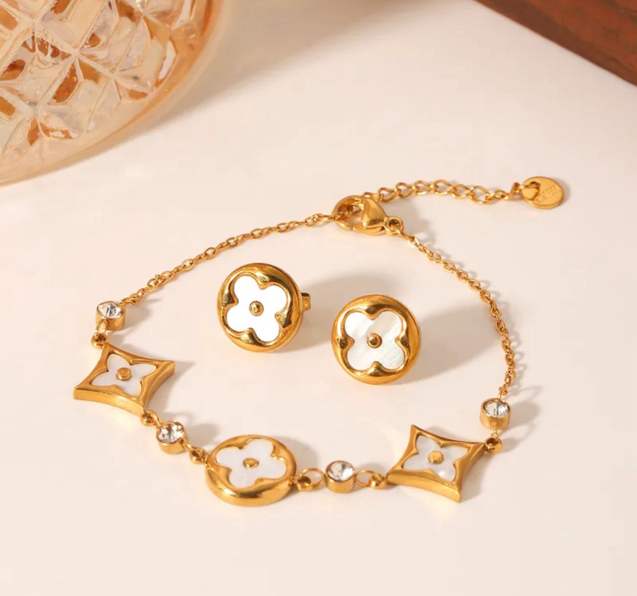 Conjunto dorado de pulsera y aretes con flores blancas de nácar y detalles brillantes. Elegante y delicado para cualquier ocasión.