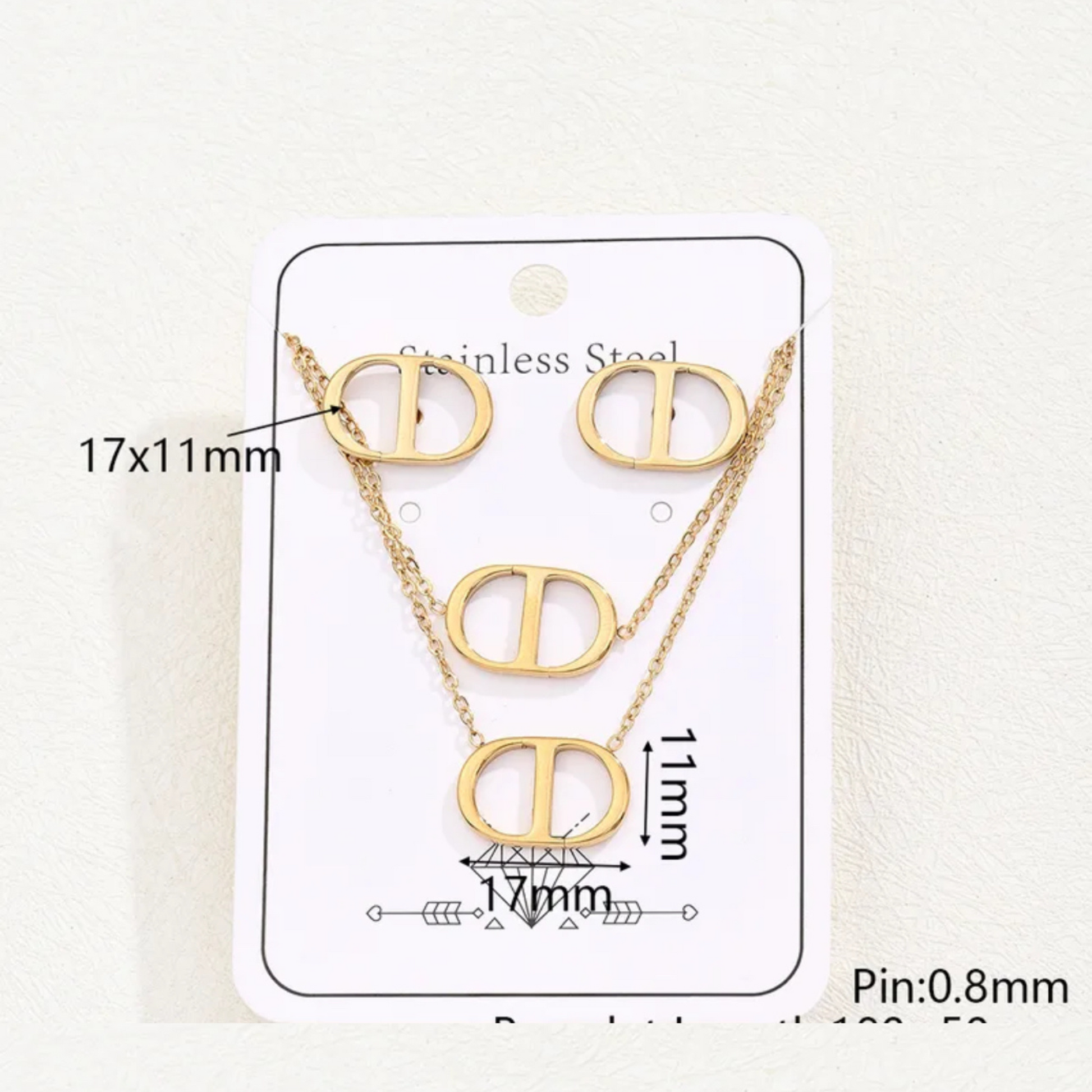 Set moderno de collar y aretes con diseño ovalado y elegante acabado dorado. Hecho de acero inoxidable, es ideal para el uso diario gracias a su resistencia y ligereza.