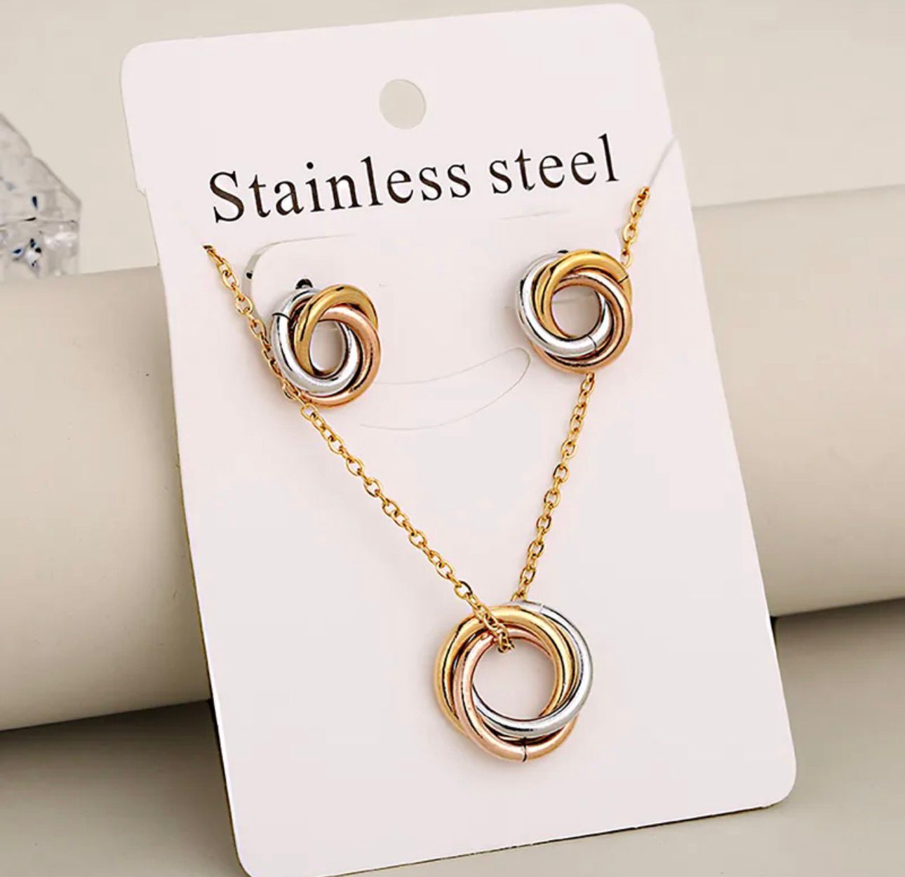 Juego de collar y aretes en acero inoxidable con diseño de nudo entrelazado en dorado, plateado y rosado. Incluye ambas piezas.
