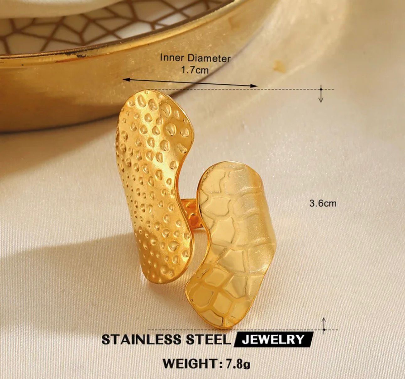 Anillo dorado ajustable con diseño irregular y acabado texturizado, moderno y original.