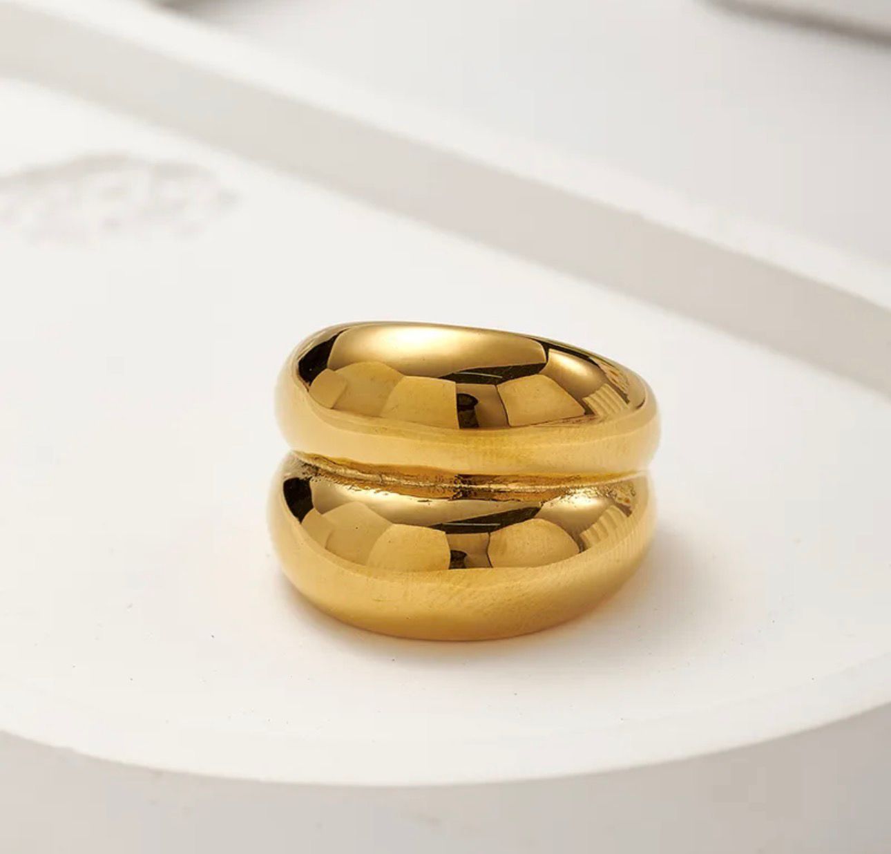 Anillo dorado ancho con diseño abombado y acabado brillante, moderno y elegante.